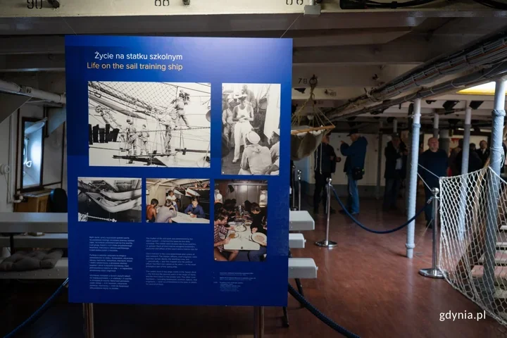 Nowa ekspozycja prowadzi przez życie załogi i uczniów, którzy w czasie rejsów szkolnych potrafili tworzyć nawet 180-osobową społeczność na jednym pokładzie. To była szkoła charakteru. Najpierw nauka nawigacji i meteorologii, później prawo morskie, języki obce i obsługa sprzętu, od sekstantu po radar. W takim trybie dnia nie było miejsca na przypadek.